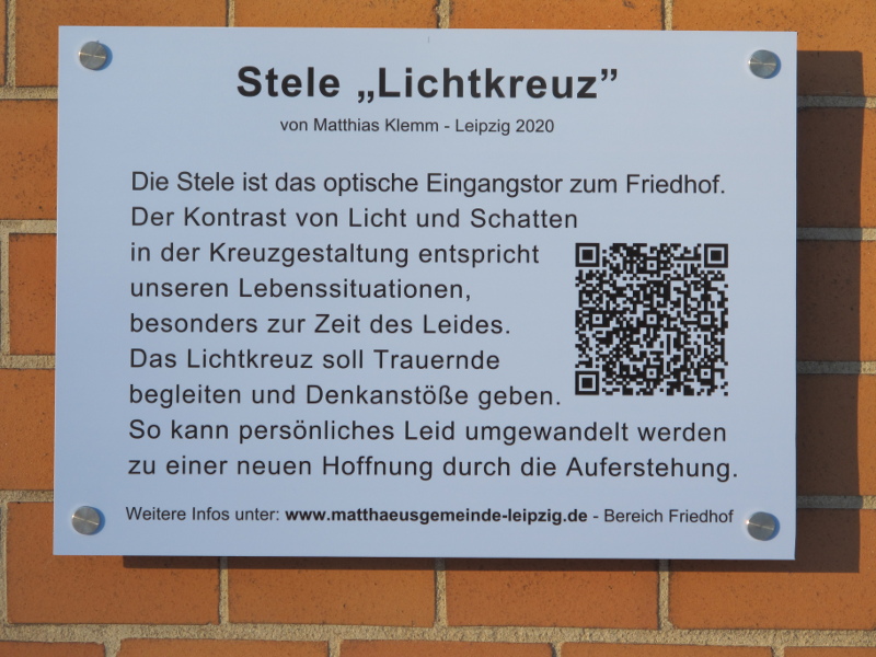 Es war in der Planung nicht vorgesehen und auch überhaupt nicht bedacht, aber die auf dem Friedhof bereits vorhandenen „profanen“ Bildplastiken, die Figur der „Marianne“ am östlichen Ende der Hauptweges (Johannes Hartmann, Laaser Marmor, 1909) und die Skulptur „Unter Last“ (Bodo Grimmer, Porphyr, 2015) im Zentrum der Kindergrabanlage „Sternenhain“ blicken beide genau in Richtung der Stele, auf das „Lichtkreuz“. Kann es ein schöneres Symbol geben, das gewollt oder ungewollt alles sich im Kreuz wiederfindet und aufgehoben ist?