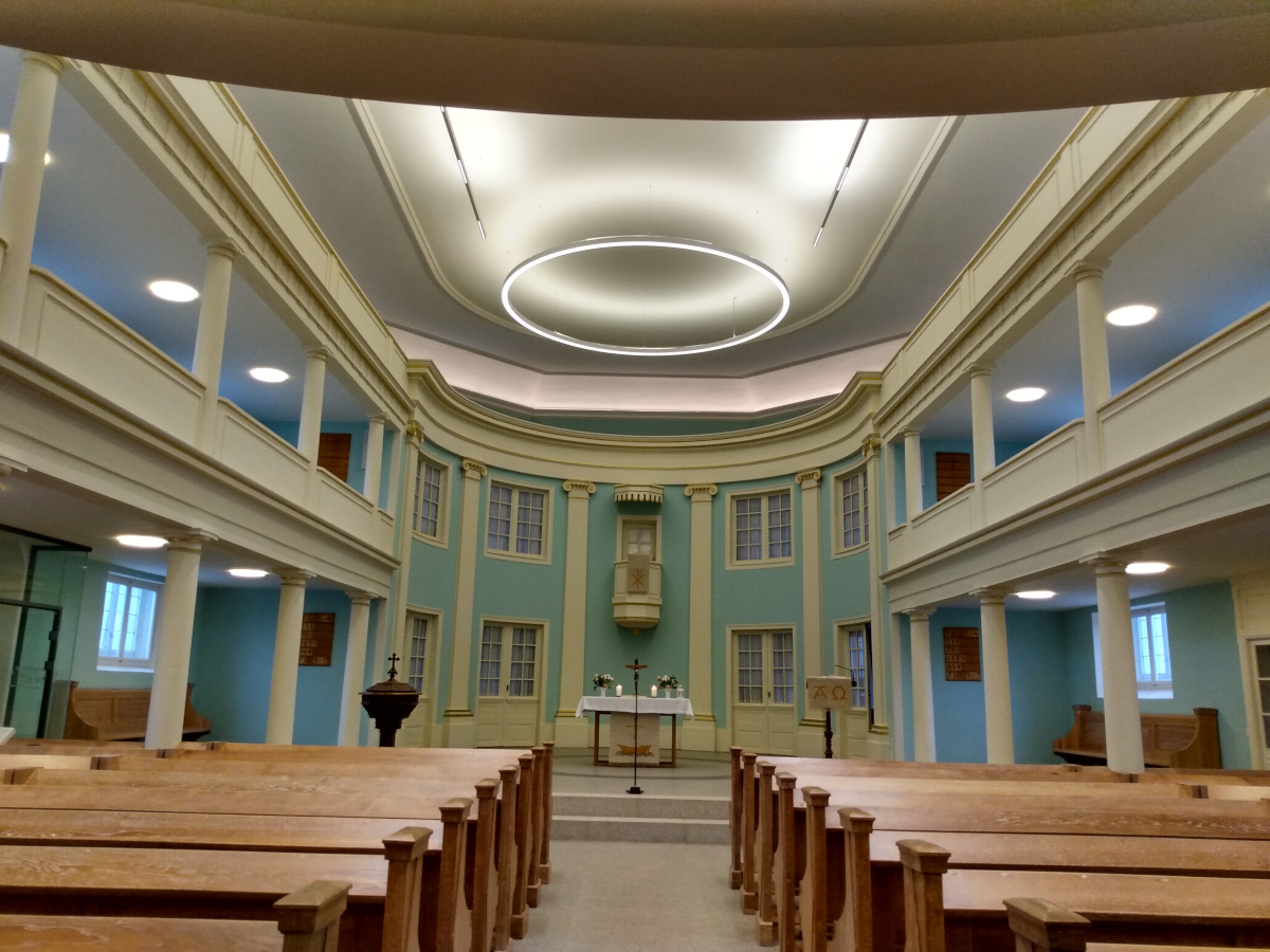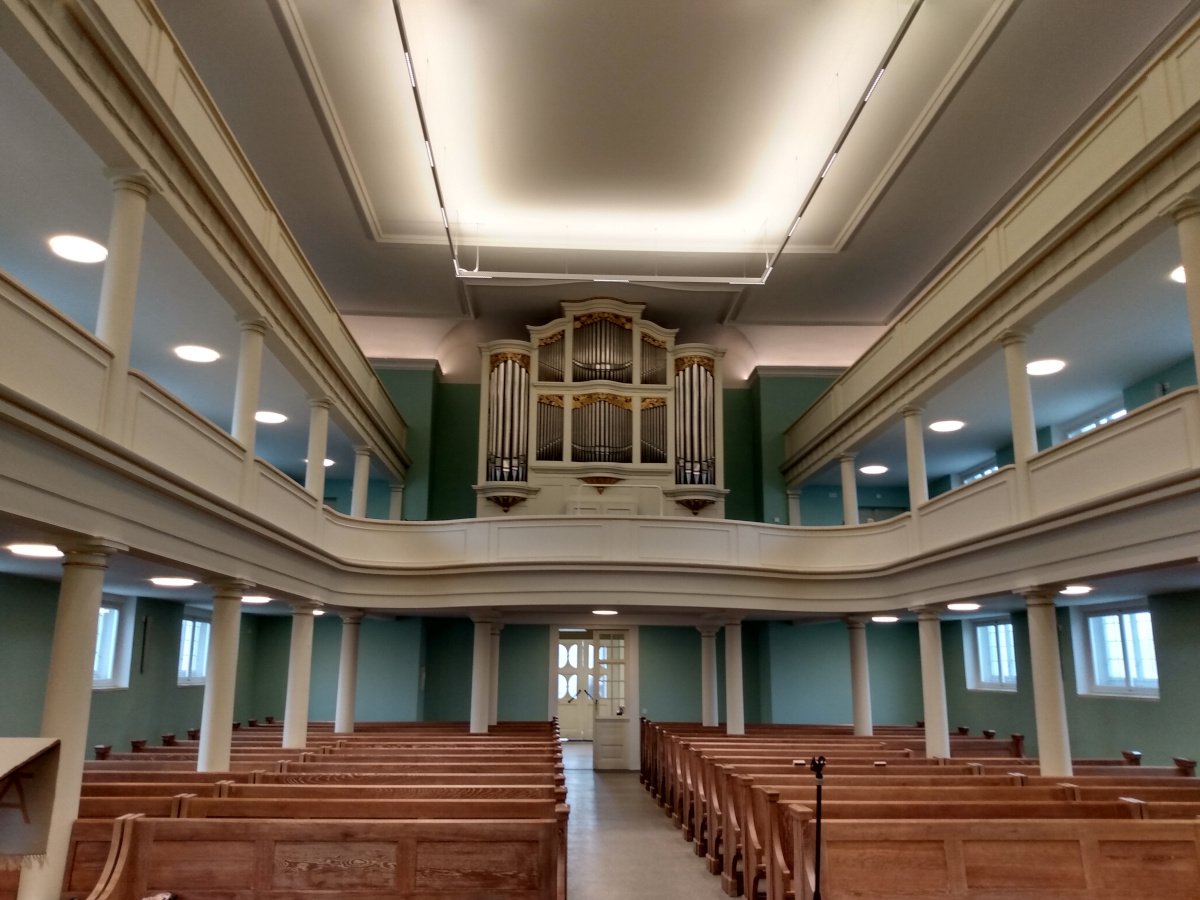 Der Innenraum hat heute wieder weitgehend die Gestalt von 1820 als klassizistische Saalkirche.